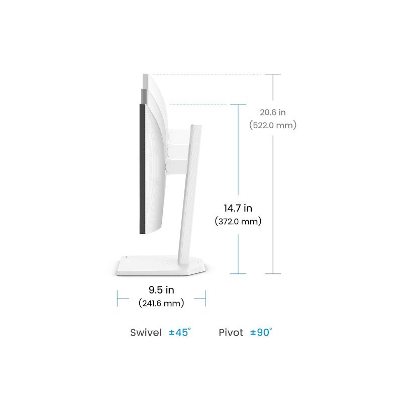 Tilt (down/up): -5Ëš – 35Ëš Swivel (left/right) : 45Ëš/ 45Ëš Pivot : 90Ëš Height Adjustment Stand : 150mm Dimensions (HxWxD) (mm): 522.0×539.8×241.6 Dimensions (HxWxD) (inch): 20.6×21.3×9.5 Dimensions (HxWxD) (Landscape) (mm): 372.0 – 522.0×539.8×241.6 Dimensions (HxWxD) (Landscape) (inch): 14.7 – 20.6×21.3×9.5 Dimensions (HxWxD) (Pivot) (mm): 639.6×315.1×241.6 Dimensions (HxWxD) (Pivot) (inch): 25.2×12.4×9.5 Dimensions (HxWxD) (w/o Base) (mm): 315.1×539.8×63.6 Dimensions (HxWxD) (w/o Base) (inch): 12.4×21.3×2.5 Net Weight (kg): 5.7 Net Weight (lb): 12.5 Net Weight (w/o Base) (kg): 3.2 Net Weight (w/o Base) (lb): 7.1 VESA Wall Mount: 100×100 mm |