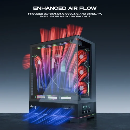 Showcase your build with a wrap-around tempered glass panel, a 250mm bottom-mounted PSU chamber, and smart RPM indicator fans up to 2600 RPM. Top and bottom dust filters enhance airflow for peak performance.