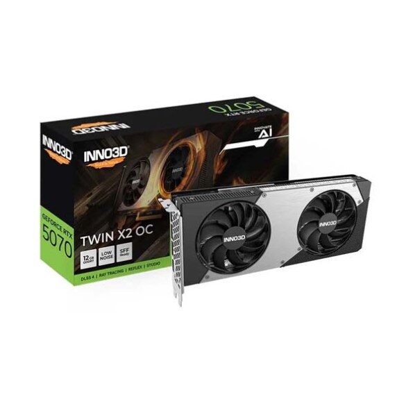 The INNO3D GeForce RTX 5070 TWIN X2 OC is a compact powerhouse designed for space-conscious enthusiasts, featuring a sleek dual-slot design that seamlessly integrates into smaller form factor builds. The TWIN X2 OC doesn’t just set new standards in performance; it also captivates with its contemporary aesthetic. This GPU features 6,144 CUDA cores and 12GB of GDDR7 memory with a 192-bit interface, and a boost clock of 2,300MHz providing ample power for high-resolution gaming and demanding applications. Redefining the balance between style, size, and raw power, this next-generation graphics card establishes itself as the new benchmark, seeking uncompromised visual excellence in a compact package.