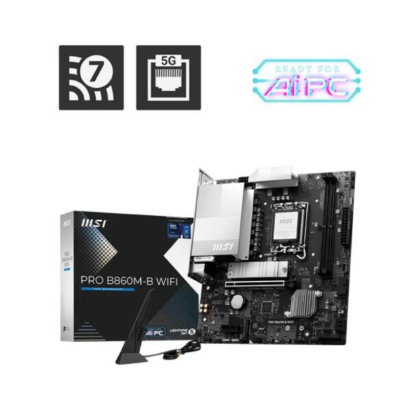 PRO B860M-B WIFI offers a simple design with a harmonious silver color scheme that perfectly matches both white and black PC builds. It is engineered with many exclusive features of MSI, a Wi-Fi 7 with EZ Antenna, 5G LAN, and PCIe 5.0 M.2, ready for the Intel® Core™ Ultra processors.